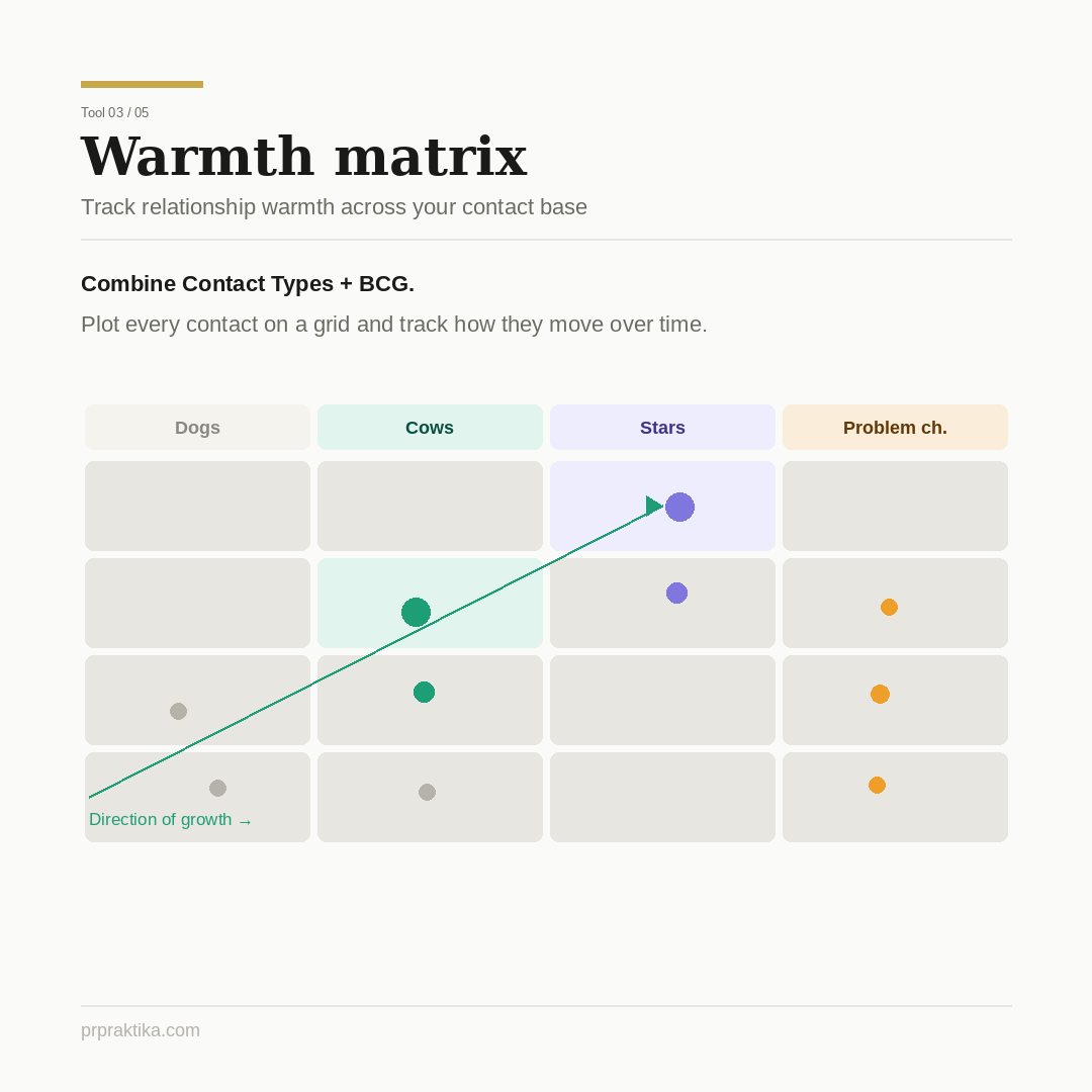 Plot your contacts on a grid: BCG categories on one axis, contact types on the other. Your goal is to move partners diagonally — from unmanageable or low-impact toward manageable and high-impact. If a journalist who never responded is now pitching you story ideas, that's warmth increasing. Track it. A monthly or quarterly update shows you exactly where your relationship-building is working and where it isn't.