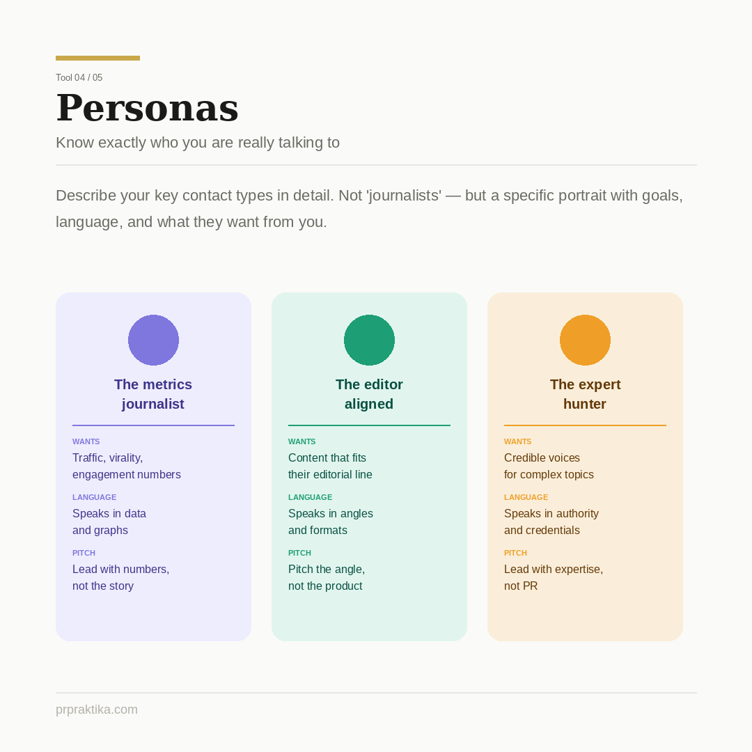 Describe the specific types of people you work with — their goals, their incentives, how they prefer to communicate, what formats they respond to. One useful persona: the metrics-driven journalist. They're not interested in your product; they're interested in what working with you will do for their traffic numbers. Pitch them in their language — data, reach, virality potential. The right persona description changes how you write every email.